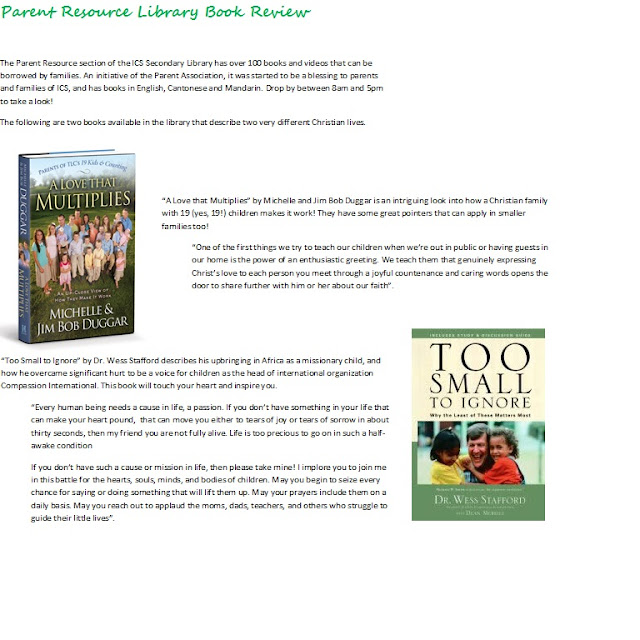 The Parent Association in conjunction with the Secondary Library is setting up a "Parent Resource" section, for parents to borrow books and teaching DVDs which will help them in raising their children.